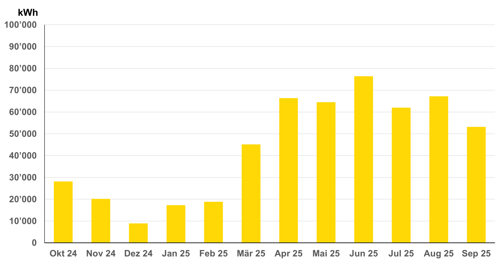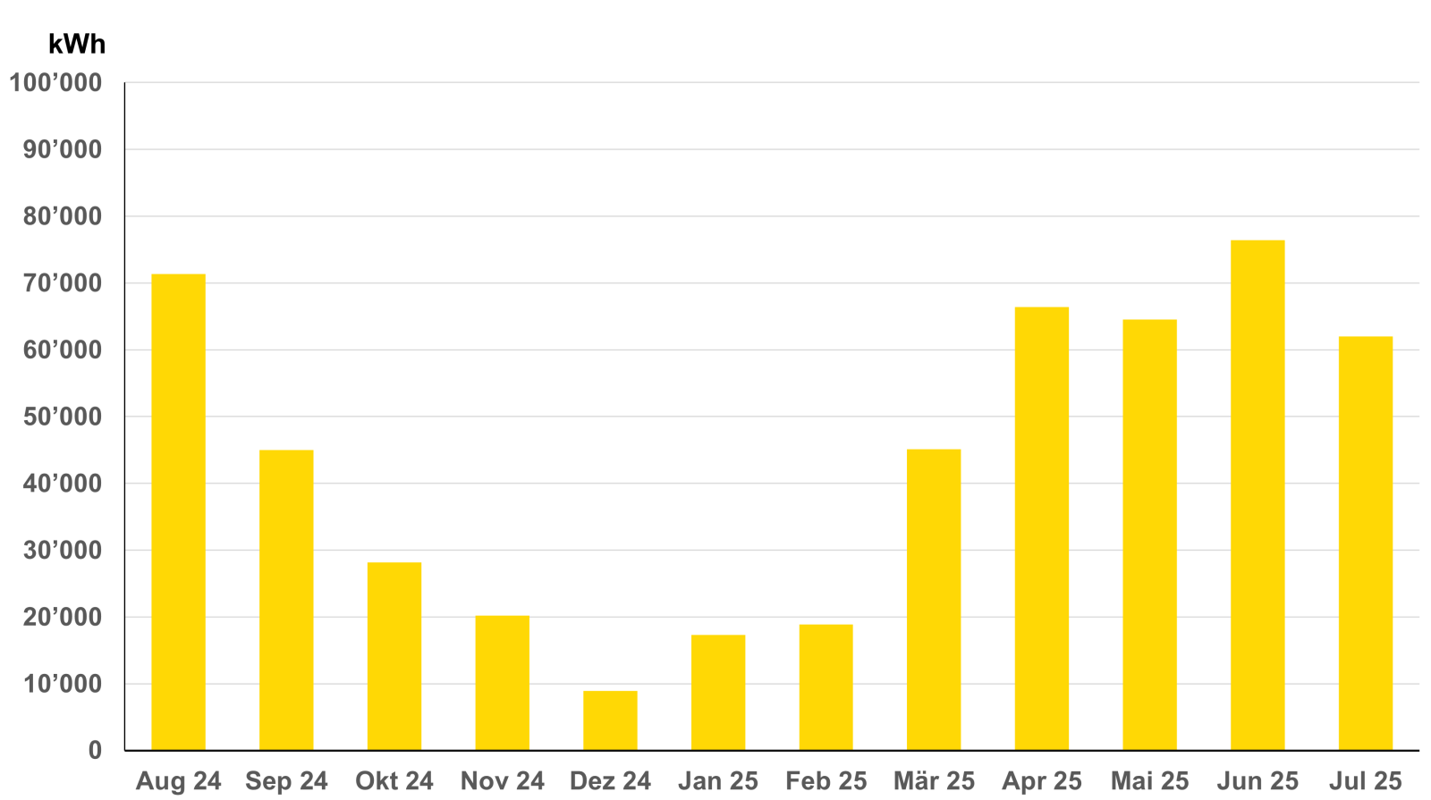 Wir freuen uns, Sie monatlich über die aktuellen Zahlen des erzeugten Solarstromertrags der Kunsteisbahn Wetzikon zu informieren. In der untenstehenden Grafik werden die Informationen der letzten 12 Monaten angezeigt.